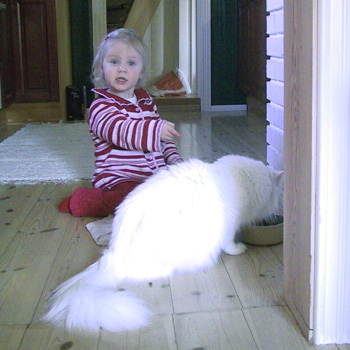 Evita left us...Evita turned 15 on the 9th of July, 2008, and was still in good shape until lately, when she started to lose weight and her fur became greasy. However she seemed to be happy and purred a lot, but she slept a lot too. I was concerned about her general appearance and condition, so I decided to take her to my vet. He found out that her kidneys were not functioning correctly, and advised me not to put her through a lot of tests and medication. I told him to do what he thought was best for her. So Evita left this world feeling comfortable and at ease. A friend of mine described Evita’s departure (as the saying goes in Norwegian): “hun forlot oss med flagget til tops!”, which means that she left this world in a good spirit. Evita used to go outside when we lived in Moltemyr and she had her first litter there. So she has been with me for a long, long time. She is the Mother and Grandmother of a lot of cats around the world, and I often look at her offsprings on the Internet. ![]() Evita with her first litter, Lotus, Luna and Loke. She was so proud! |